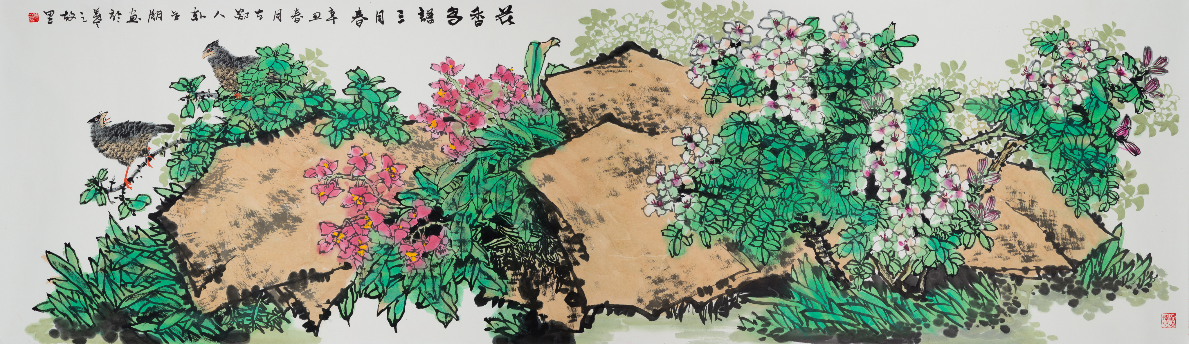Title: 《花香鸟语三月春》/"Flowers and Birds in March Spring"Size: 96X240cmIntroduction to the artist: Han Lipeng, male, the owner of...